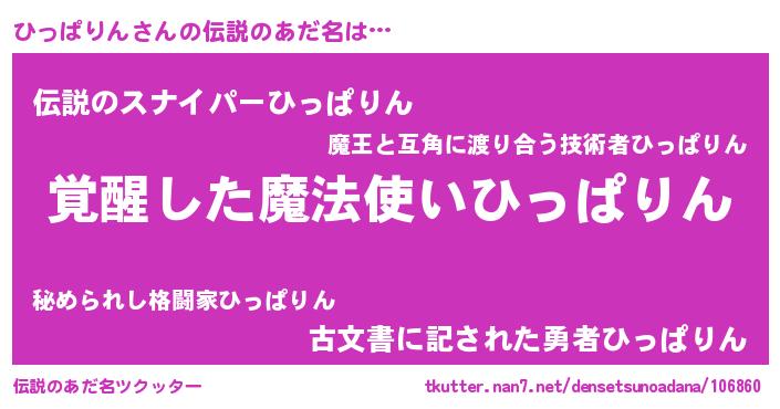 | 男性向けラノベタイトル風あだ名 | 『ひっぱりん~年齢イコール彼女いない歴の魔法使い~』 |