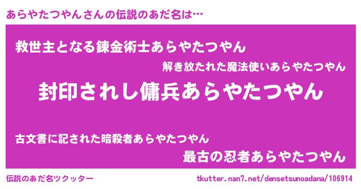 | 男性向けラノベタイトル風あだ名 | 『Re:あらやたつやんから始める異世界生活』 |