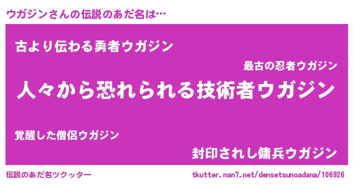 | ヒーロー風カッコイイあだ名 | 『正義の使者ウガジン』『ネオウガジン』 |