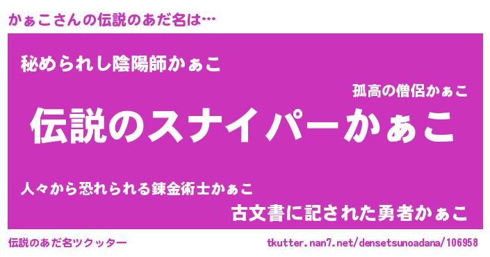 | 男性向けラノベタイトル風あだ名 | 『魔法科高校のかぁこ』『かぁこの憂鬱』 |