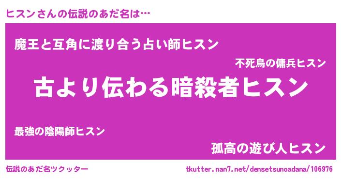 | 男性向けラノベタイトル風あだ名 | 『この素晴らしい世界にヒスンを!』 |