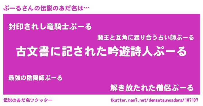 | 男性向けラノベタイトル風あだ名 | 『ぷーる~年齢イコール彼女いない歴の魔法使い~』 |