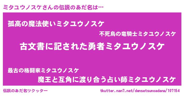 | 男性向けラノベタイトル風あだ名 | 『ミタユウノスケ~年齢イコール彼女いない歴の魔法使い~』 |