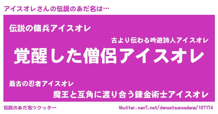 | 男性向けラノベタイトル風あだ名 | 『アイスオレの嫁は女の子じゃないと思った?』 |