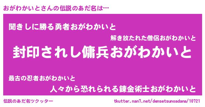 | 胡散臭い通販商品みたいなあだ名 | 『あなたにだけ特別に提供する限定10本のレアな日本酒…その名も「おがわかいと」』 |