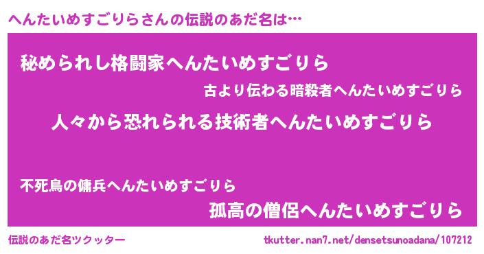| ヒーロー風カッコイイあだ名 | 『正義の使者へんたいめすごりら』 |