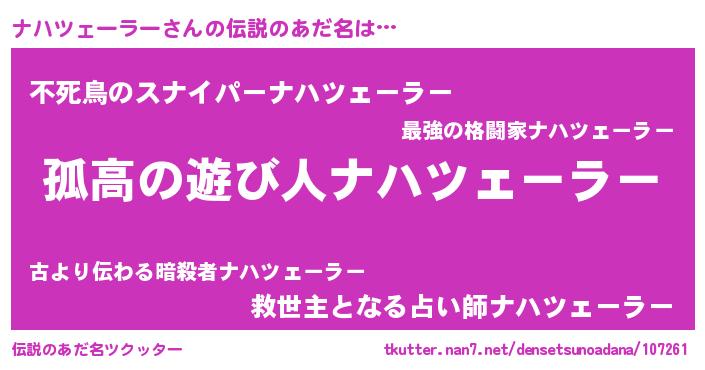 | 女子向けラノベタイトル風あだ名 | 『ナハツェーラーなんてお断りですっ。』 |