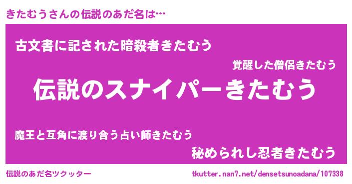 | 男性向けラノベタイトル風あだ名 | 『魔弾の王ときたむう』『きたむうの憂鬱』 |