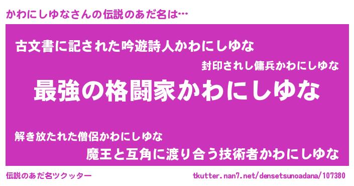 | 男性向けラノベタイトル風あだ名 | 『この素晴らしい世界にかわにしゆなを!』 |