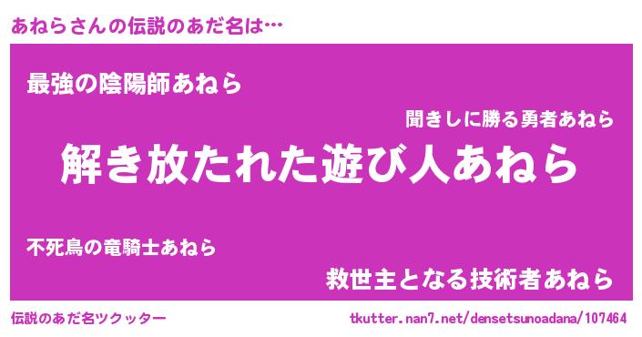 | ヒーロー風カッコイイあだ名 | 『魔戒騎士アネ』『最強戦士アネラ』 |