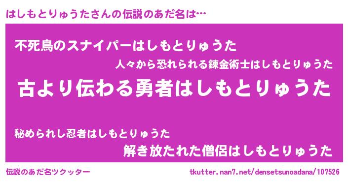 | 意味不明あだ名 | 『住所不定無職はしもとりゅうた(86歳)』 |