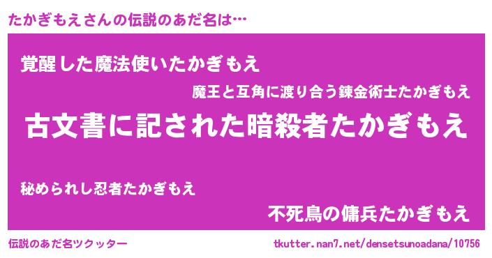 | ポケモン風あだ名 | 『ゼニタカ』『ヒタカギモエ』 |