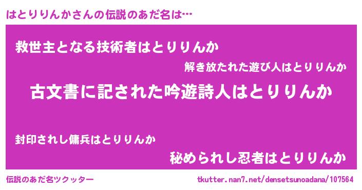 | 胡散臭い通販商品みたいなあだ名 | 『あなたにだけ特別に提供する100年もののヴィンテージワイン…その名も「はとりりんか」』 |