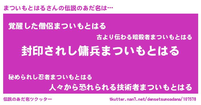 | 男性向けラノベタイトル風あだ名 | 『まついもとはる~年齢イコール彼女いない歴の魔法使い~』 |