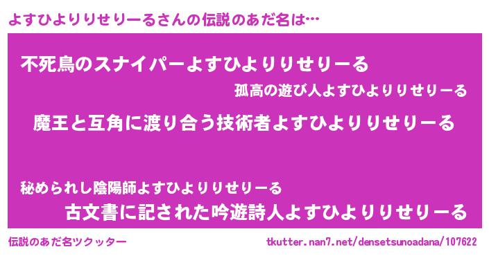 | 男性向けラノベタイトル風あだ名 | 『ノーゲーム・ノーヨスヒヨリリセリール』 |