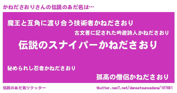 | 胡散臭い通販商品みたいなあだ名 | 『必ず成功する霊験あらたかなお札…その名も「かねださおり」』 |