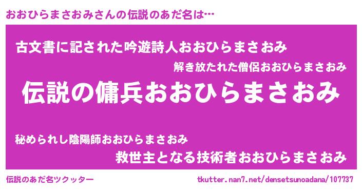 | 男性向けラノベタイトル風あだ名 | 『おおひらまさおみの憂鬱』 |