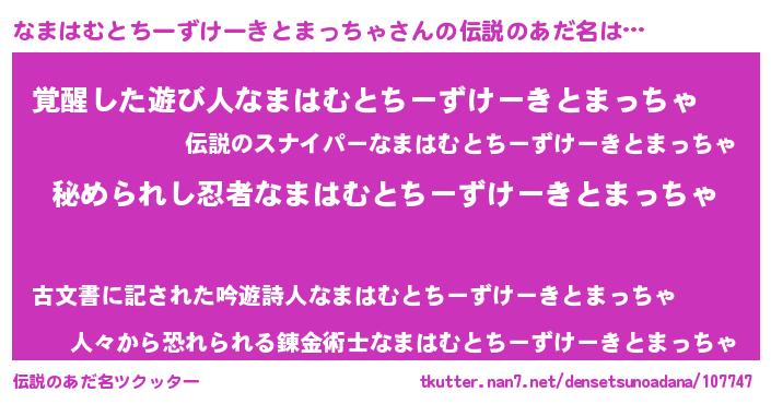 | 意味不明あだ名 | 『自称なまはむとちーずけーきとまっちゃ』 |
