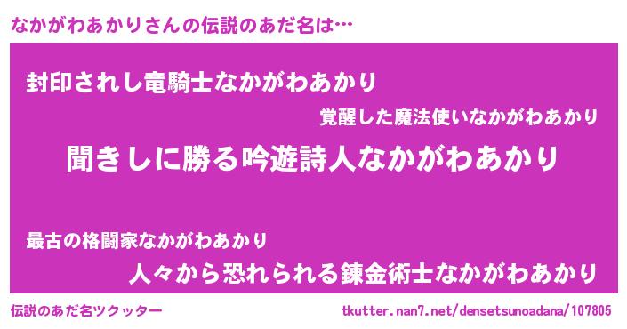 | 女子向けラノベタイトル風あだ名 | 『異世界で失敗しない100のなかがわあかり』 |