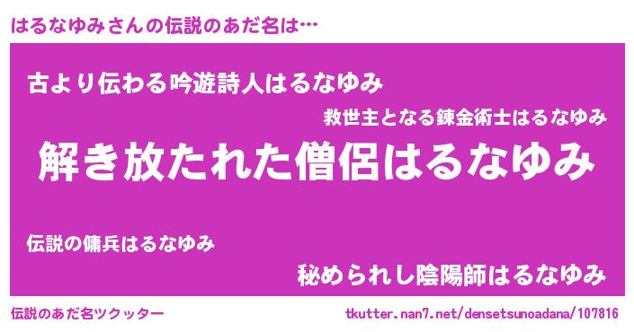 | ポケモン風あだ名 | 『ヒハルナユミ』『ハールイ』 |
