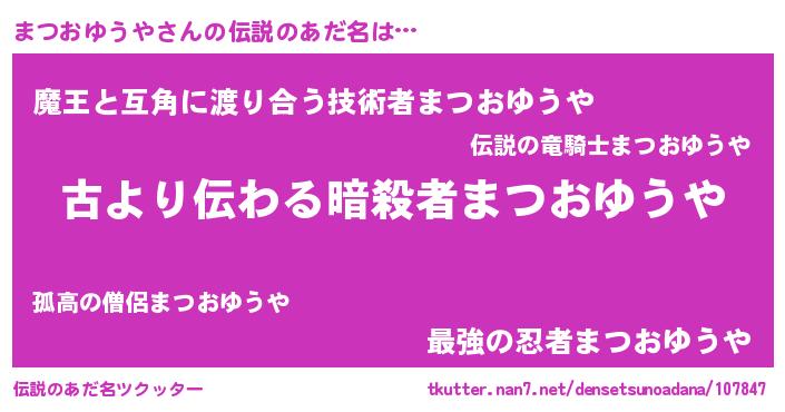 | 男性向けラノベタイトル風あだ名 | 『この素晴らしい世界にまつおゆうやを!』 |