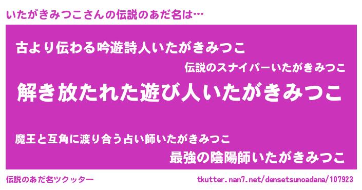 | 意味不明あだ名 | 『とにかく怪しいいたがきみつこ』 |