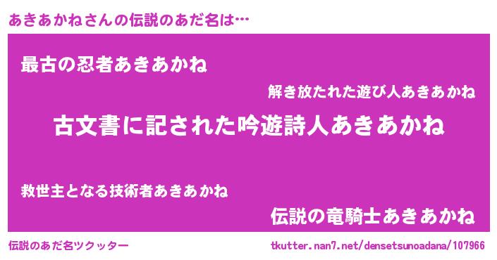 | 意味不明あだ名 | 『永久保存あきあかね』『自称あきあかね』 |