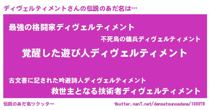 | 男性向けラノベタイトル風あだ名 | 『ディヴェルティメント~年齢イコール彼女いない歴の魔法使い~』 |