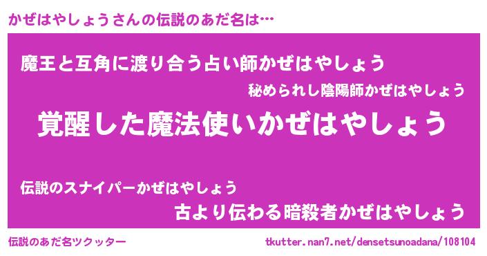 | ポケモン風あだ名 | 『ヒカゼハヤショウ』『カックウザ』 |