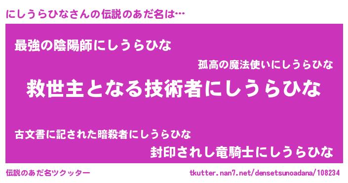 | 男性向けラノベタイトル風あだ名 | 『うちのにしうらひなが世界を掌握している!』 |