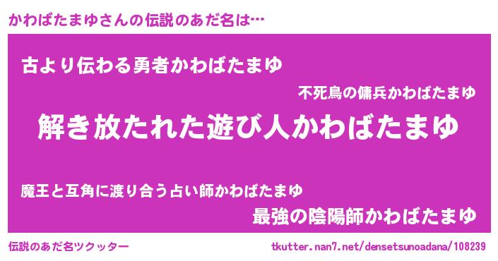 | 女子向けラノベタイトル風あだ名 | 『かわばたまゆの卵を拾いまして』 |
