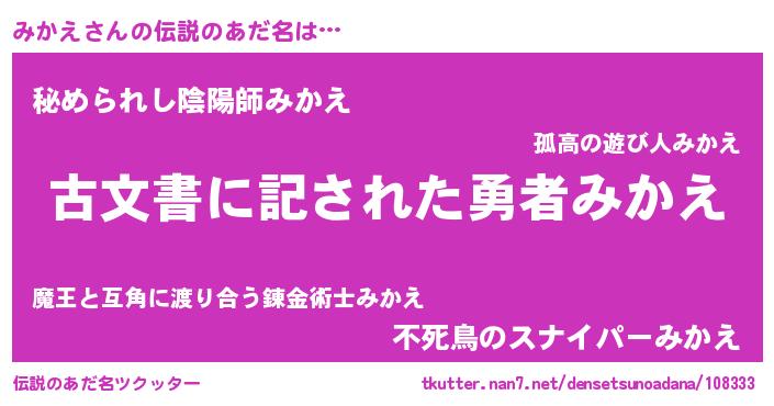 | 男性向けラノベタイトル風あだ名 | 『みかえに滅ぼされるだけの簡単なお仕事です』 |