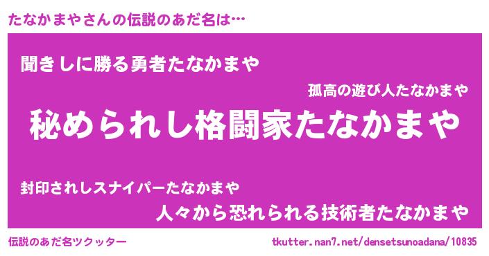 | ヒーロー風カッコイイあだ名 | 『超時空戦士タナカマヤ』『炎刃騎士タナ』 |