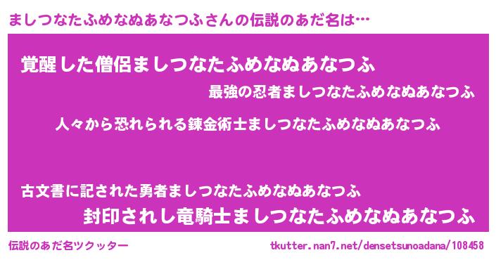 | 女子向けラノベタイトル風あだ名 | 『ましつなたふめなぬあなつふなんてお断りですっ。』 |