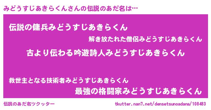 | 意味不明あだ名 | 『住所不定無職みどうすじあきらくん(7歳)』 |