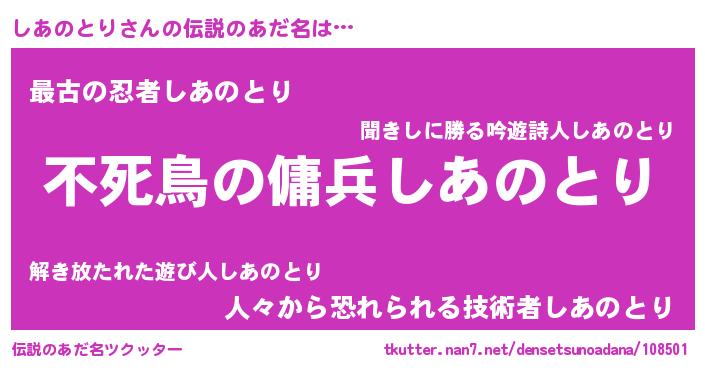 | 男性向けラノベタイトル風あだ名 | 『転生したらしあのとりだった件』 |
