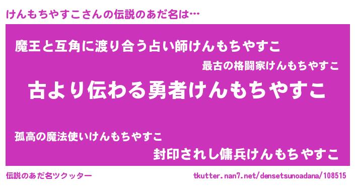 | ヘコむあだ名 | 『けんもちやすこ(遠い目)』『けんにゅー』 |