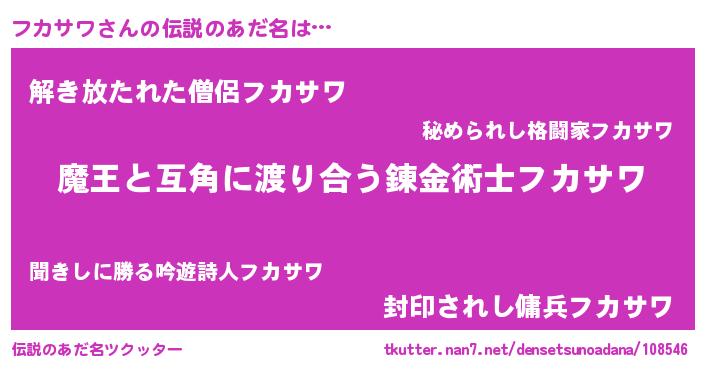 | ヒーロー風カッコイイあだ名 | 『慈愛の使者フカサワ』『幻影騎士フカ』 |