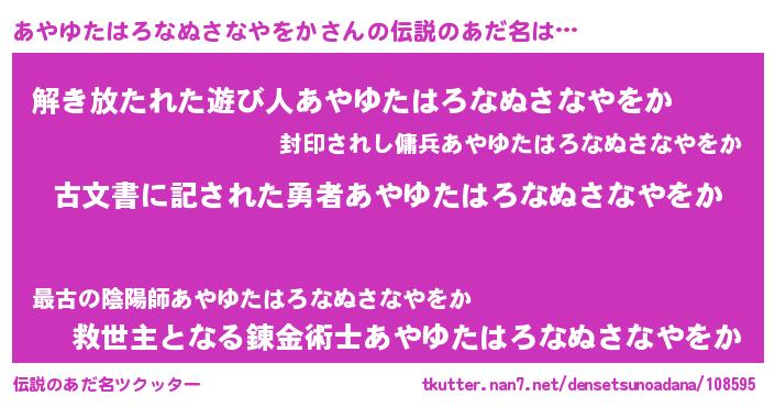 | 男性向けラノベタイトル風あだ名 | 『Re:あやゆたはろなぬさなやをかから始める異世界生活』 |