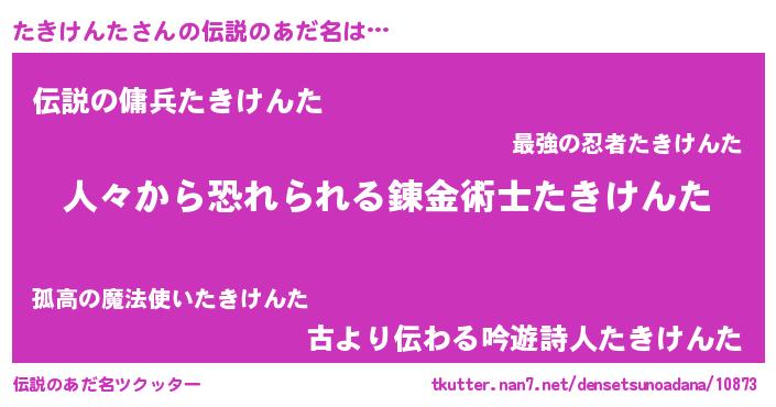 | 男性向けラノベタイトル風あだ名 | 『おまえをオタクにしてやるから、俺をたきけんたにしてくれ! 』 |