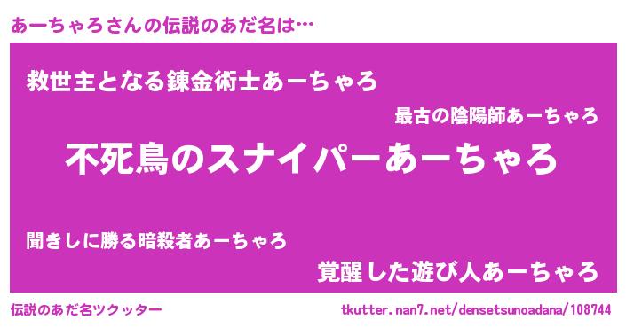 | 男性向けラノベタイトル風あだ名 | 『あーちゃろに滅ぼされるだけの簡単なお仕事です』 |