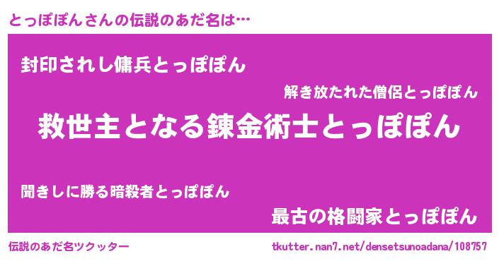 | 男性向けラノベタイトル風あだ名 | 『とっぽぽんに滅ぼされるだけの簡単なお仕事です』 |