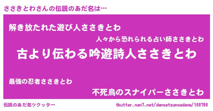 | ヘコむあだ名 | 『ささきとわ(笑)』『ささぷりん』 |