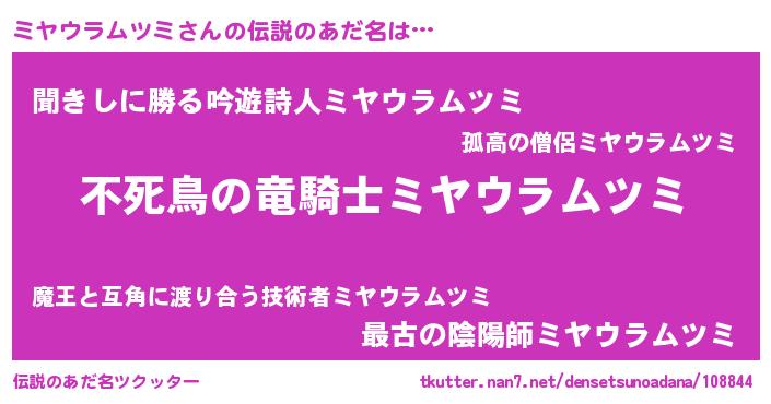 | 女子向けラノベタイトル風あだ名 | 『ミヤウラムツミ姫と円卓の騎士』 |