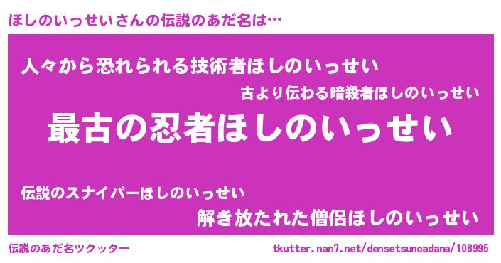 | 意味不明あだ名 | 『住所不定無職ほしのいっせい(68歳)』 |