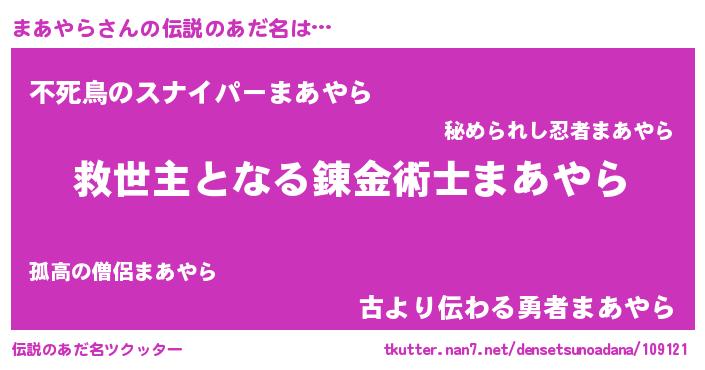 | ヒーロー風カッコイイあだ名 | 『慈愛の使者まあやら』『仮面マアダー』 |