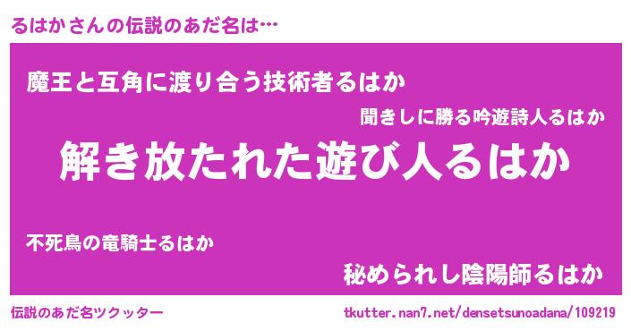 | ヒーロー風カッコイイあだ名 | 『魔戒騎士ルハ』『慈愛の使者るはか』 |