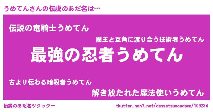 | 男性向けラノベタイトル風あだ名 | 『Re:うめてんから始める異世界生活』 |