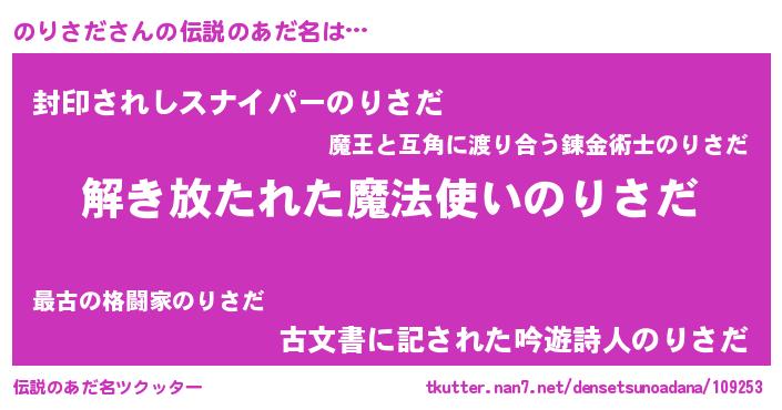 | 男性向けラノベタイトル風あだ名 | 『のりさだに滅ぼされるだけの簡単なお仕事です』 |