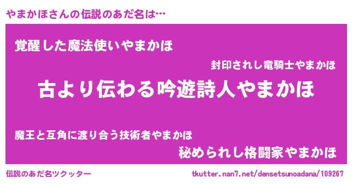 | ヒーロー風カッコイイあだ名 | 『ネオヤマカホ』『魔戒騎士ヤマ』 |